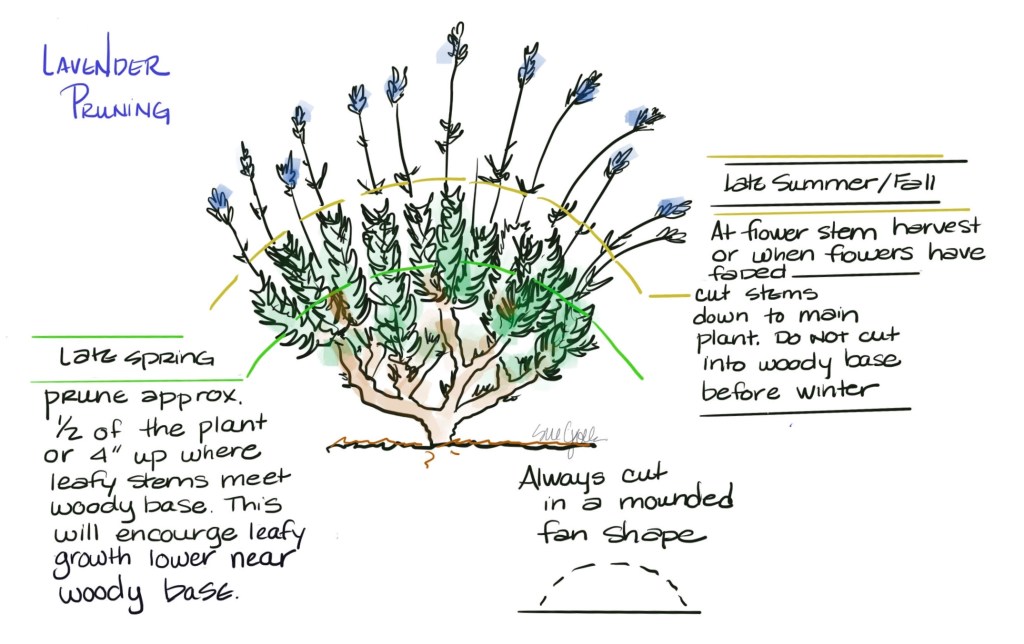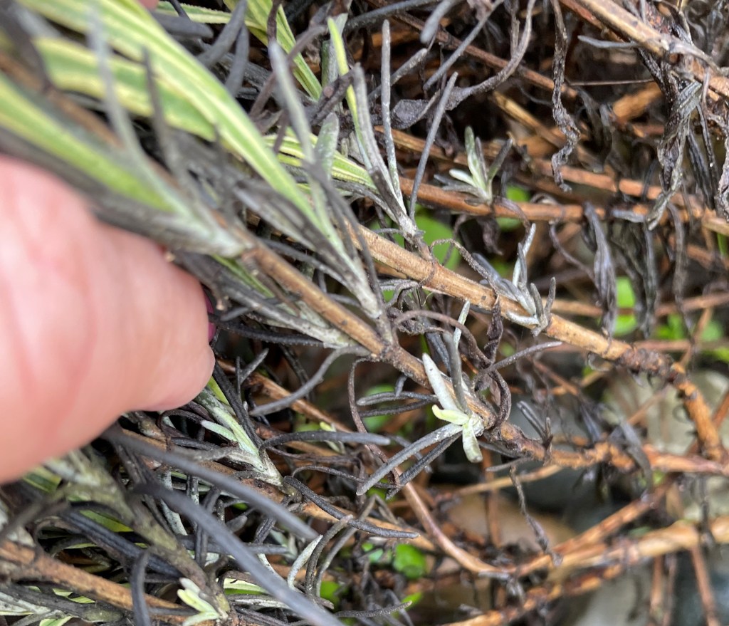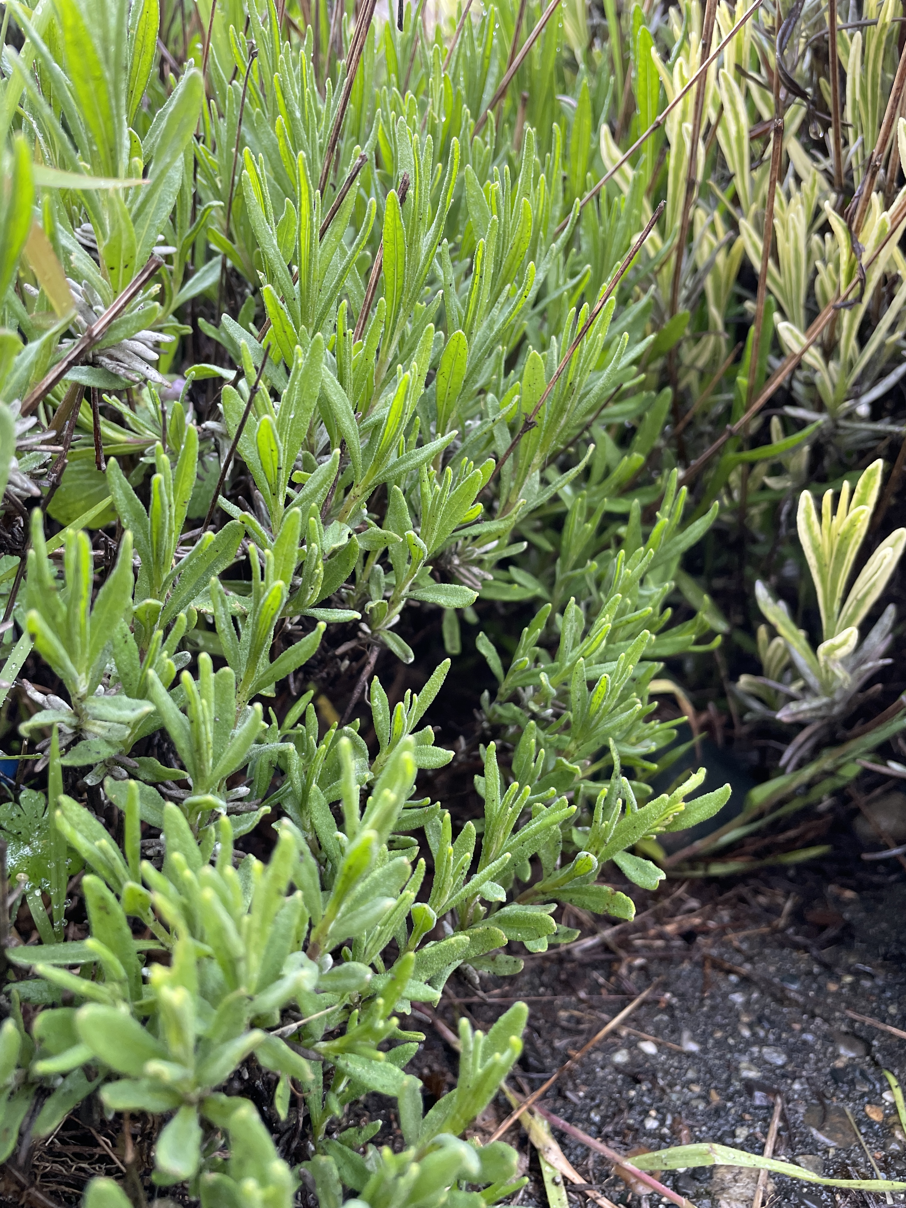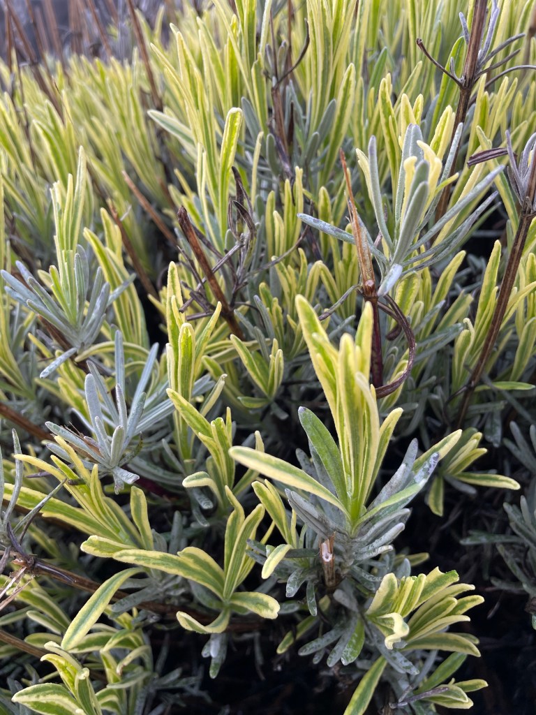 Lavender ready for a good spring renovation? Look for new leaf buds along the lower woody parts of the plants. You can cut to this new growth to encourage it to fill in along the base. The new spring growth is all aglow on variegated Platinum Blonde™ Lavender. Best to trim this one lightly in the fall so you can enjoy the fab color of the new spring growth. – Cut the typical English lavender (angustifolia)-L. ‘Hidcote” shown here and Spanish (stoechas) in the early spring to revive woody growth and shape for the season.